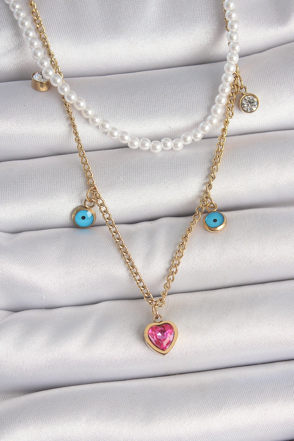 316L Çelik Gold Renk 2'Li İnci Zincir Model Pembe Taşlı Kalp Figür Nazar Boncuk Detay Kadın Kolye