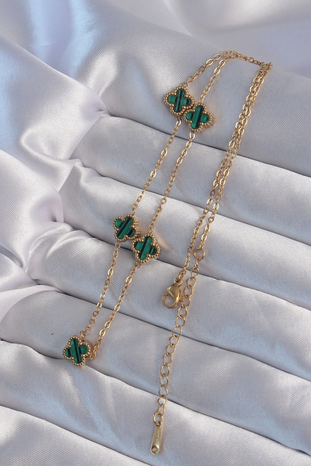 316L Çelik Gold Renk Minimal Yeşil Mineli Yonca Kolye