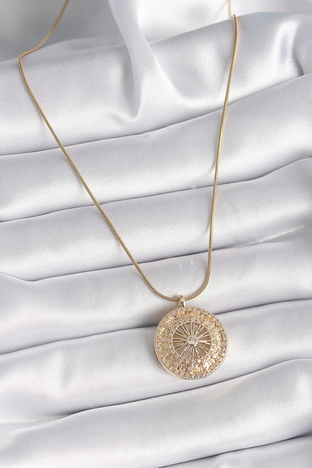 316L Çelik Gold Renk Zirkon Taşlı 12 Burç Madalyon Model Kadın Kolye