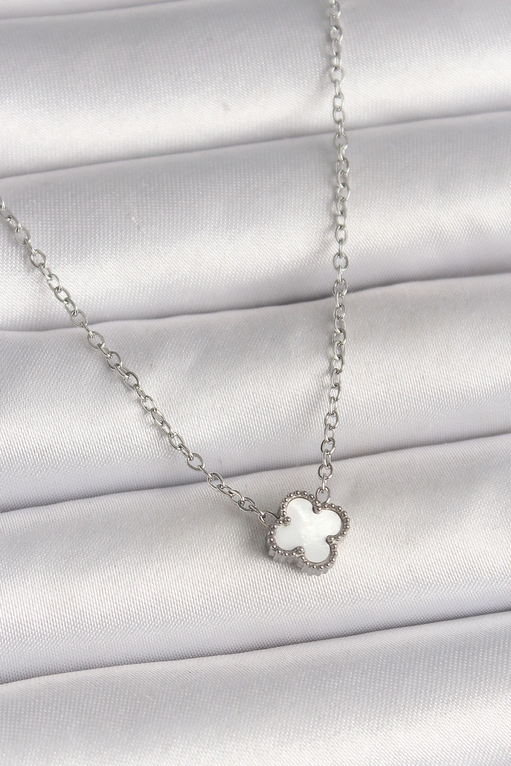 316L Çelik Gümüş Renk Beyaz Yonca Model Kadın Kolye