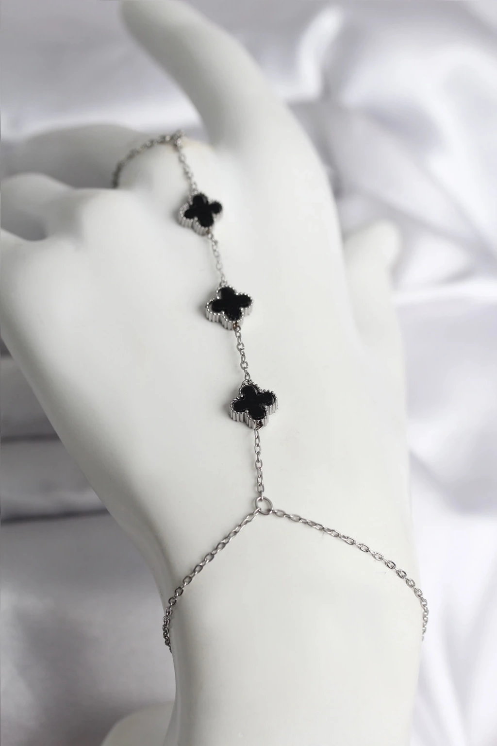 316L Çelik Gümüş Renk Siyah Yonca Model Kadın Şahmeran