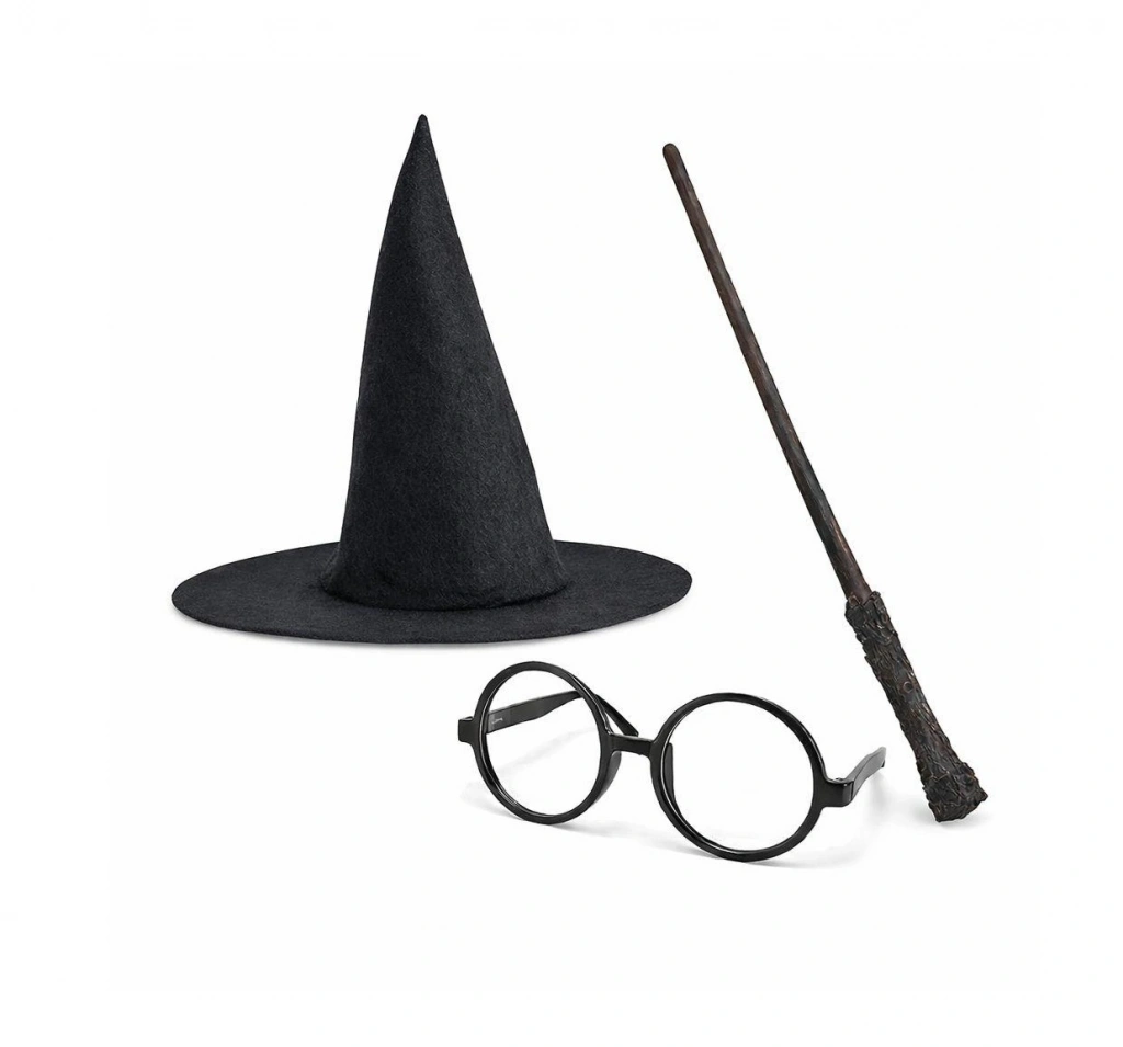 Set içerisinde sihirbaz şapkası, büyücü asası ve yuvarlak gözlük yer almaktadır.