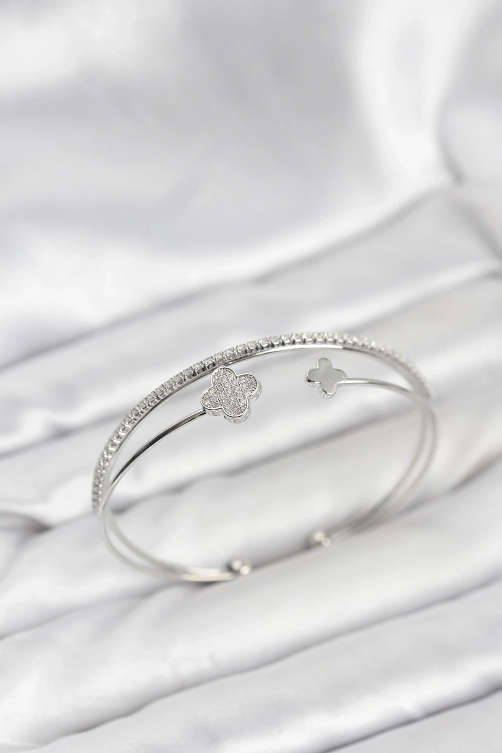 316L Çelik Zincir Gümüş Renk Zirkon Taşlı Yonca Beyaz Kadın Bileklik